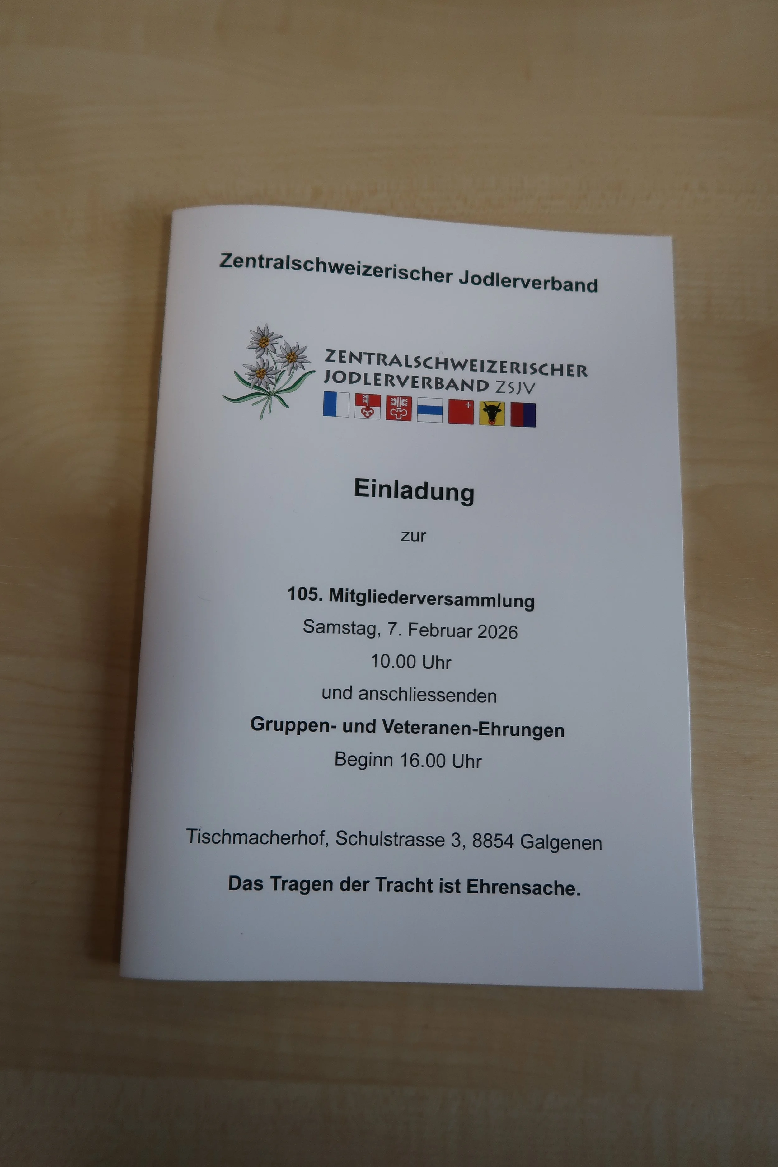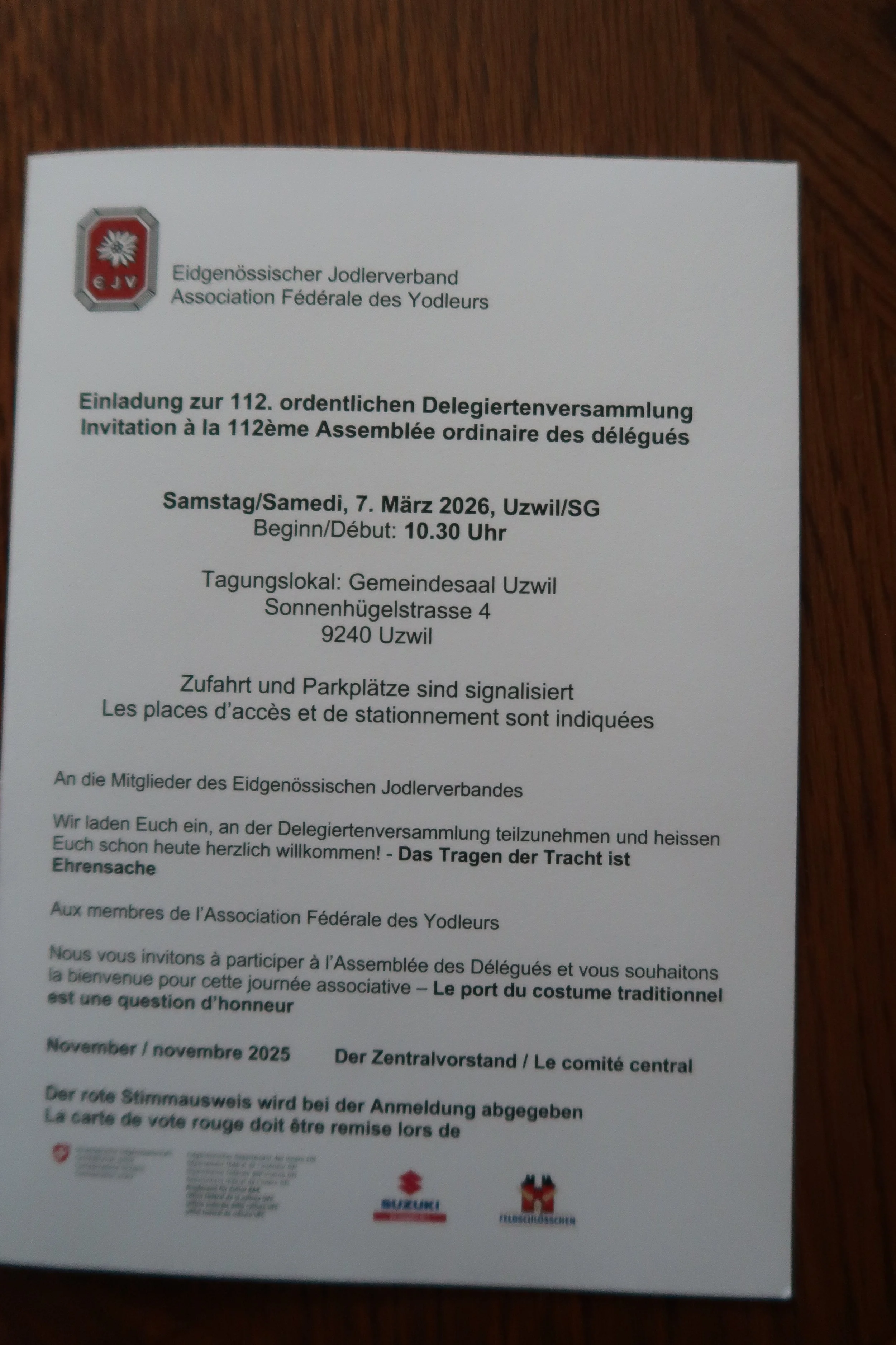 112. Delegiertenersammlung des Eidgenössischen Jodlerverbandes, Samstag, 7. März 2026 10.30 Uhr in Uzwil